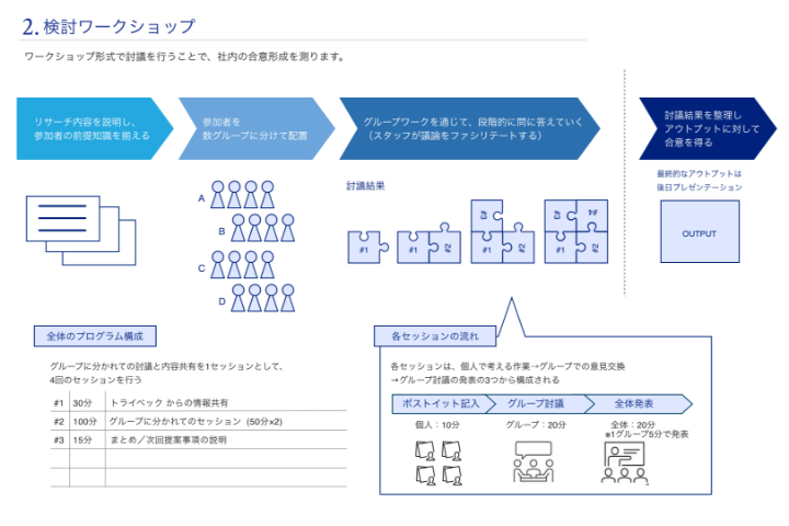 次に現状分析のため、顧客が感じている企業に対する印象をヒアリングし、さらにプロジェクトメンバーや関連部署のメンバーで実施するデザインワークショップを通して、企業の方向性(あるべき姿)を抽出するなど、多角的な視点からアウトプットへの検討手法を選択していきます。これにより、規模の大小を問わず要件に応じたブランドマネジメントが可能となり、また将来的なブランド認識の受容性をも検討することができるのです。