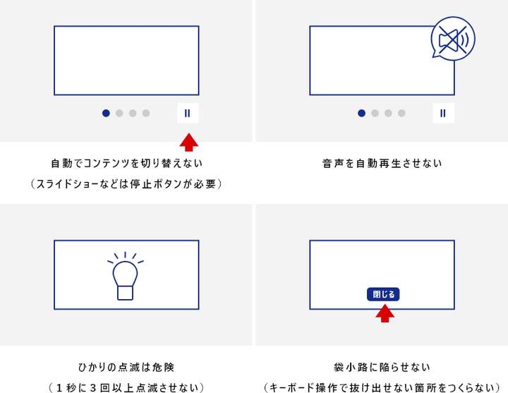 ・自動でコンテンツを切り替えない(スライドショーなどは停止ボタンが必要)