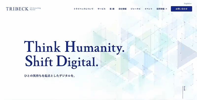 トライベックのWebサイトのメインビジュアルにおいても、社名の由来のひとつである“トライアングル”をモチーフとしたアニメーションで、このダイナミックアイデンティティの考え方を一部取り入れています。