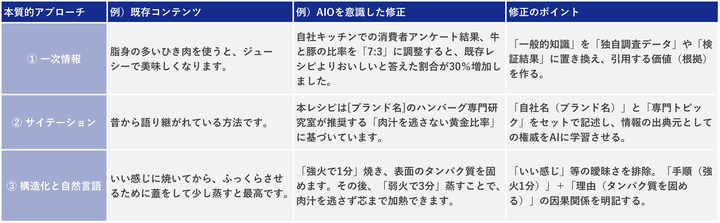 これまで見てきたように、AIOの基本はAIに抽出されやすいよう「情報を切り分ける」ことです。それではその考え方をベースに、さらにAIから「引用すべき価値がある」と判断されるための、3つのポイントをご紹介します。