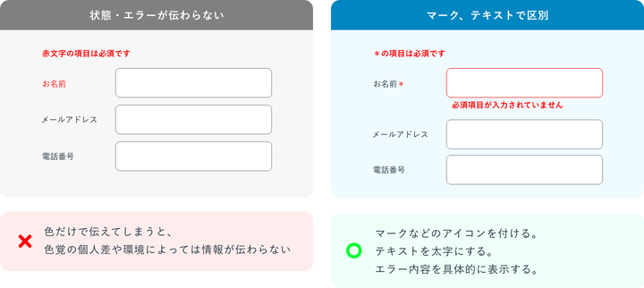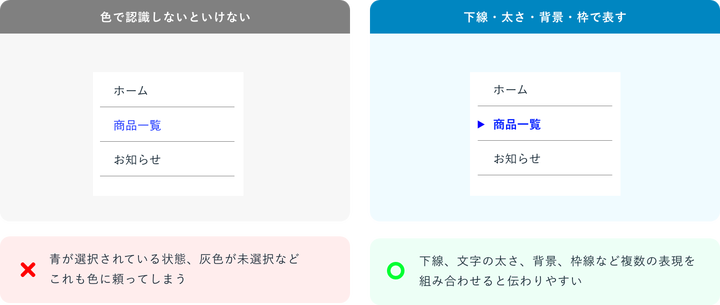そのため WCAG(Web Content Accessibility Guidelines)では、「色だけで情報を伝えてはいけない」 と明確に定義されています。