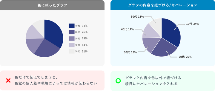 色と内容を、色以外の要素でも紐づけることが重要です。また、グラフにセパレーション(区切り線)を用いることで、色が識別しづらい場合でも情報を正しく伝えることができます。