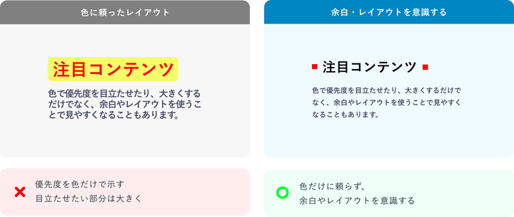 レイアウトそのものが情報の重要度を語るように設計することで、色に頼らない整理が可能になります。単に色やサイズだけで強調するのではなく、余白や配置による視線の流れで優先度を伝えることが重要です。