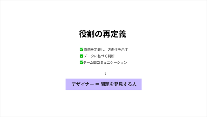 といった、制作以前の意思決定プロセスです。単に見た目を整えるのではなく、データや背景を踏まえながらチームと共通理解をつくり、プロジェクト全体の方向性を導く存在へと変化しています。