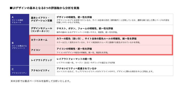実施してきたUIデザイン分析では、「B:サイトを構成するデザインパーツ」の「2.カラースキーム」と「3.アイコン」に課題を持つサイトが多くありました。