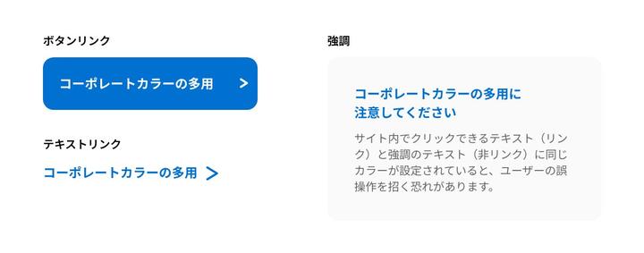 例えばクリックできるテキスト(リンク)と強調のテキスト(非リンク)に同じカラーが設定されていると、ユーザーの誤操作を招く恐れがあるため、カラールールを見直す、リンク箇所へ下線を付けるなど、視覚的な区別をしやすくすることが望ましいです。