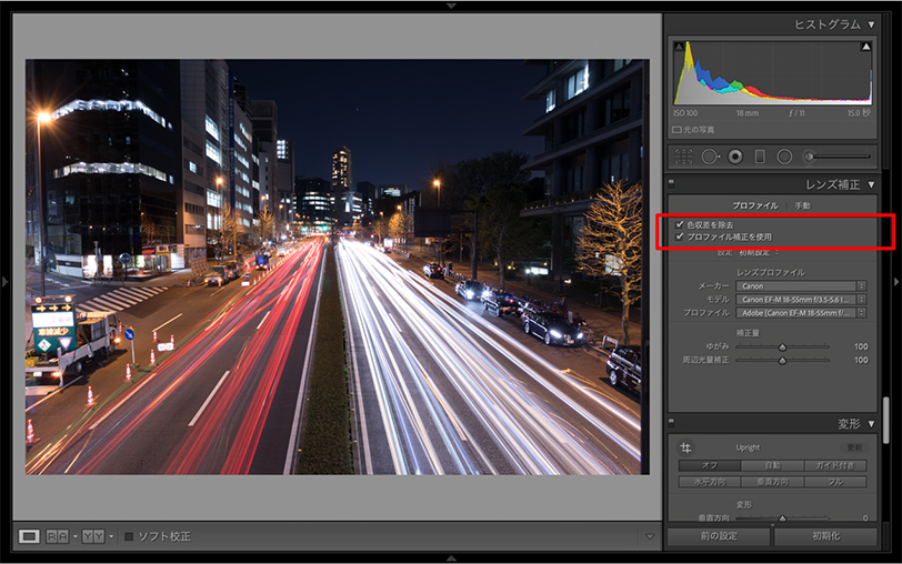 レンズ補正を適用する