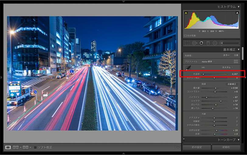 「色温度※3」をそこそこ下げます。今回だと2,267にしました。