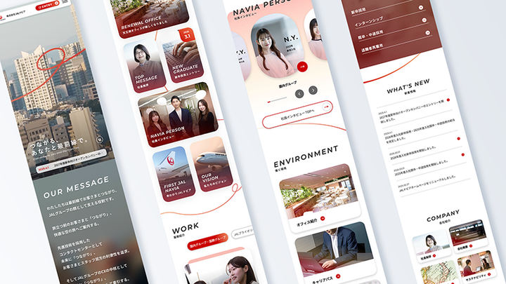 UI/UXデザインやサイト構築においてはJALグループのブランドイメージを活かしつつ、「つながり」をベースに上品かつ現代的なイメージで、サイトの目的や設計思想を適切に反映させることを意識しました。動画やインタラクティブデザインを効果的に活用することで求職者だけでなくすべての来訪ユーザーに対してプレゼンテーション力の高い、好感・共感につながるサイトへと刷新しました。