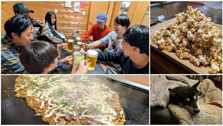 運よく個室貸し切りで、くつろげるうえ、お店にいた黒柴犬が可愛かったり、目の前で弾けて味付けされるポップコーンを楽しんだり、何より、手際よく作られた熱々のもんじゃ焼きをはじめとした美味しい料理に大盛り上がりとなりました。