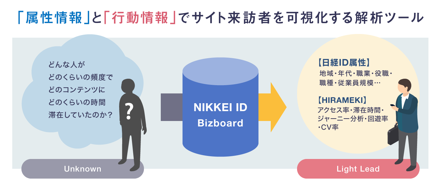 「NIKKEI ID Bizboard」では、日経電子版ユーザーの会員情報とオウンドメディアに来訪した際の行動データを、日経IDとHIRAMEKIのIDデータを連携させ紐づけることで、匿名ユーザーに対しても日経ID属性による分析が可能となります。具体的には、オウンドメディアに来訪する顧客について「企業名」「役職」「従業員規模」「興味関心カテゴリ」などの属性情報を付与することで、より実態に近い顧客像をイメージできるようになるとともに、オウンドメディアに反応するか、反応しないか、といったユーザーの属性分析が行えます。