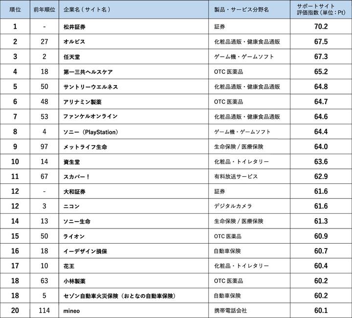 サポートサイト評価指数ランキング<総合ランキング上位20サイト>